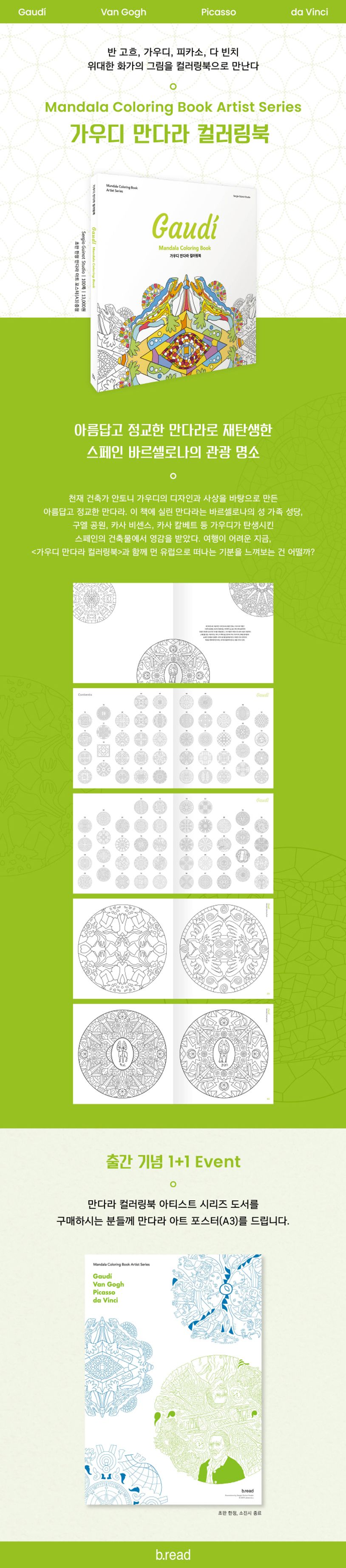 천재 건축가 안토니 가우디, 한국인이 사랑하는 화가 빈센트 반 고흐, 20세기 대표 화가 파블로 피카소, 위대한 예술가로 불리는 레오나르도 다 빈치에 이르기까지. ‘만다라 컬러링북 아티스트 시리즈’는 가장 대중적이고 유명한 서양 예술가 4명의 대표작을 만다라로 재해석한 컬러링북이다. 뛰어난 작품성의 원화와 만다라라는 새로운 형태의 콜라보. ‘만다라 컬러링북 아티스트 시리즈’는 위대한 예술가의 삶과 작품 세계를 통해 자연과 거리의 풍경을 묘사한 기존의 컬러링북과는 다른 신선한 재미를 선사할 것이다.