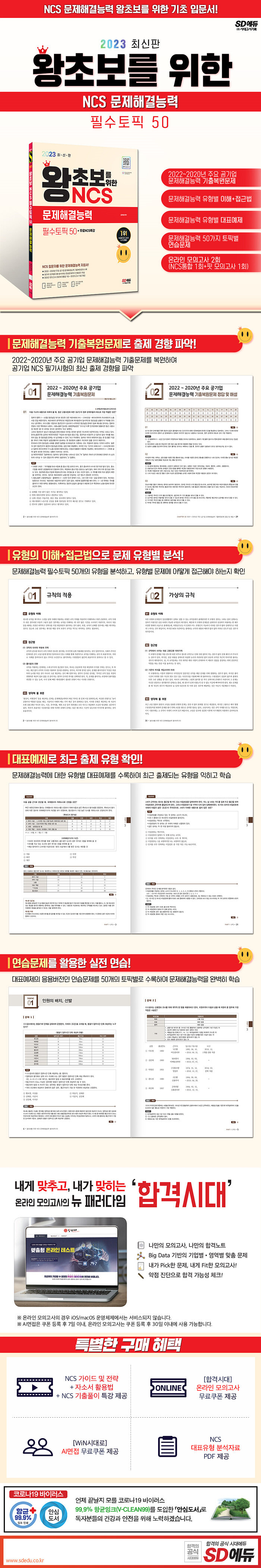 공사·공단 필기시험 합격을 위해 (주)SD에듀에서는 채용을 대비하여 문제해결능력 맞춤형 문제로 구성한 『2023 최신판 왕초보를 위한 NCS 문제해결능력 필수토픽 50+무료NCS특강』을 출간하였다. 상세한 해설로 혼자서도 학습이 가능하도록 하였으며, 온라인 모의고사를 무료로 응시할 수 있는 쿠폰을 발급하여 문제해결능력 문제 유형에 대한 연습과 함께 자신의 실력을 최종 점검할 수 있도록 하였다..