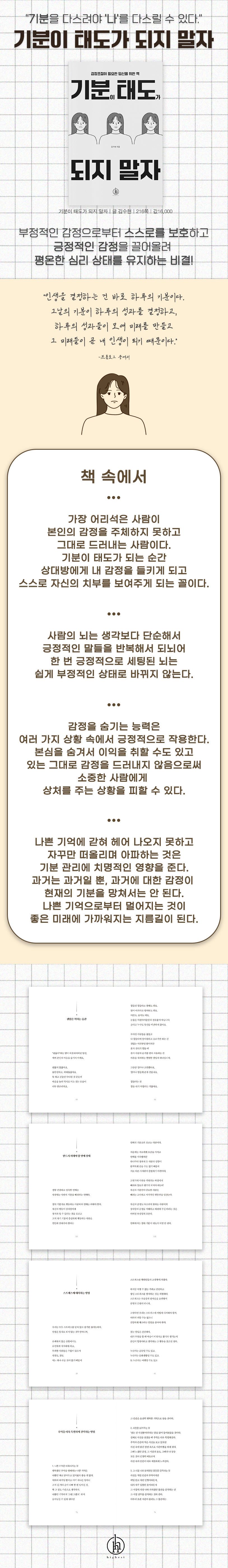 인생을 결정하는 건 바로 하루의 기분이다. 그날의 기분이 하루의 성과를 결정하고,하루의 성과들이 모여 미래를 만들고그 미래들이 곧 내 인생이 되기 때문이다. 감정을 조절하면 미래가 바뀐다.