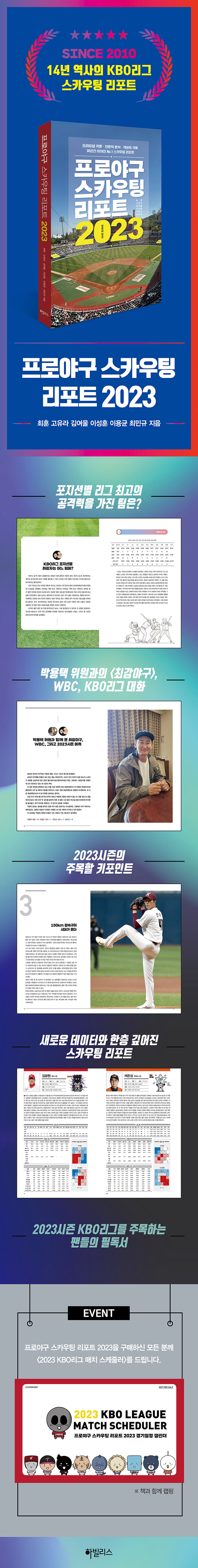 《프로야구 스카우팅 리포트》는 2007년 출간된 『스포츠2.0 + 프로야구 컴플리트 가이드』의 아이디어를 토대로, 2008년부터 오랜 기획 과정을 거쳐 2010년 첫 책이 출간된 후로 14년 연속으로 팬들이 쉽게 야구의 세계에 빠져들 수 있도록 안내하고 있는 KBO리그 야구 가이드다. 2023시즌에도 발행된 이번 책에서는 구종별 회전수, 타구속도, 강한타구% 등 지금 야구팬들에게 각광받고 있는 새로운 기록과 한층 긴 분량과 세밀해진 스카우팅 리포트를 담았다.