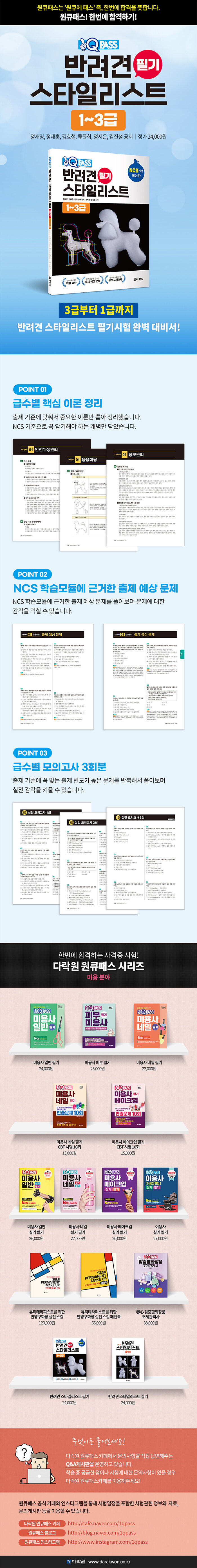 국가공인 반려견 스타일리스트 자격 검정을 준비하는 수험자들을 위해 제작된 필기시험 안내서입니다. 본문은 NCS의 학습모듈에 근거하여 3급, 2급, 1급의 등급별 이론 요약과 예상 문제를 수록하였습니다. 이를 통해 이론과 문제에 대한 감각을 익히고, 최종적으로 등급별 모의고사를 통해 이론의 숙지 상태를 점검하며 필기시험을 준비할 수 있습니다.