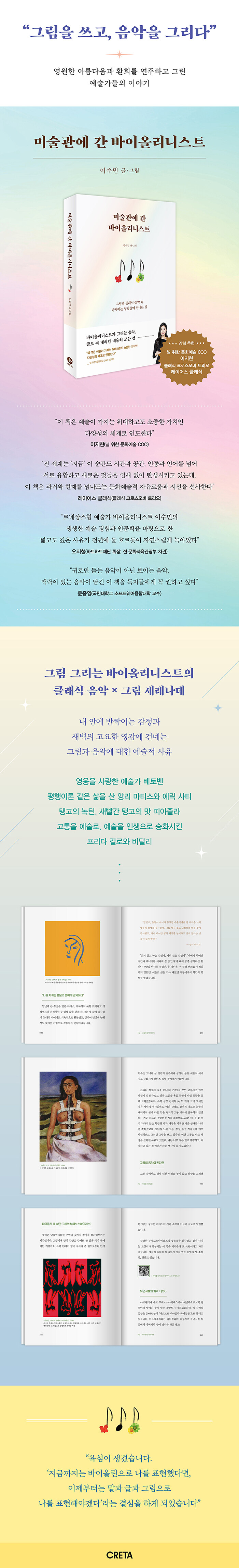 “‘지금까지는 바이올린으로 나를 표현했다면, 이제부터는 말과 글과 그림으로 나를 표현해야겠다’라는 결심을 하게 되었습니다.” 7년 전 우연한 기회에 ‘사랑’을 주제로 한 음악을 골라 강연을 하게 되었고, 그때부터 말과 그림으로 대중에게 음악을 알렸다. 대중의 반응을 즉각적으로 확인하고, 클래식을 자신만의 방식으로 해설하는 데 재미를 느낀 후 본격적인 해설자의 길로 들어서며 친숙한 예술을 추구하고 있다. 30년 동안 클래식과 바이올린을 통해 자신을 표현한 연주자, 그럼에도 미처 다 풀지 못한 감정을 그림에 담은 예술가, 음악 이야기와 그림으로 깊게 소통하고 싶은 작가 이수민의 예술 세계를 한 권에 담았다.