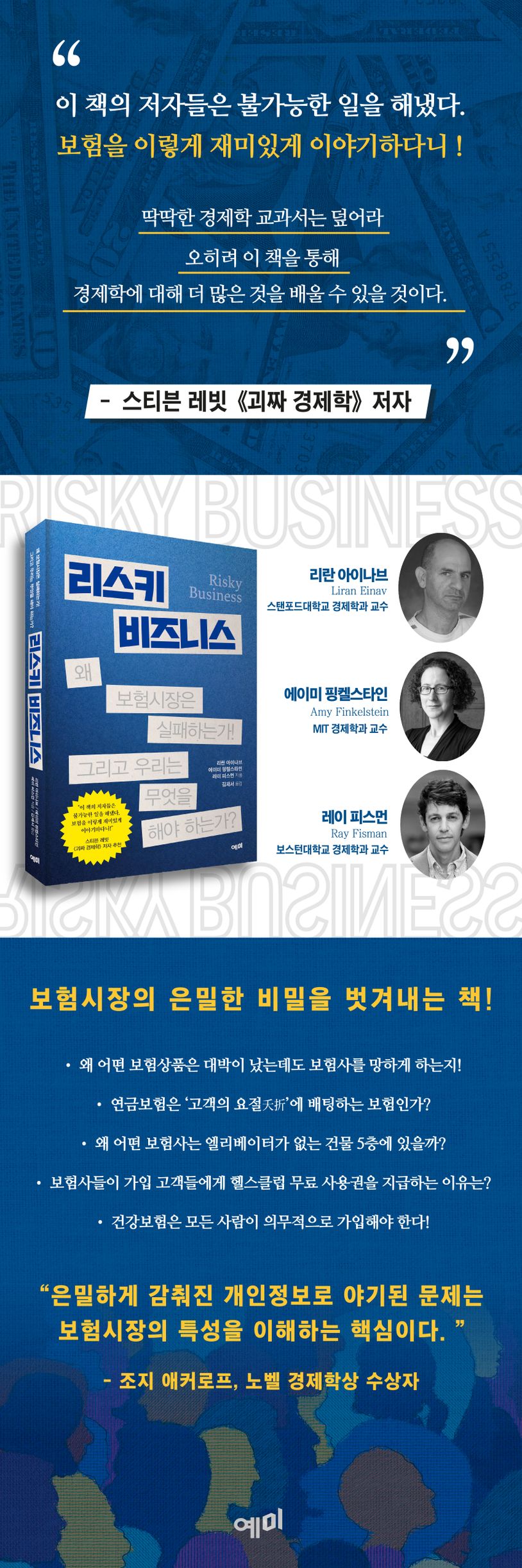 《리스키 비즈니스》는 보험산업의 예를 들어 선택의 문제를 다루고 있지만, 선택의 문제는 보험산업에만 국한된 문제가 아니다. 현대사회는 정보의 시대다. 정보를 더 많이 가지고 있는 자가 그리고 그것을 적절하게 활용할 줄 아는 자가 비즈니스라는 게임에서 승리하는 시대다. 《리스키 비즈니스》는 바로 이 점에서 정보의 시대를 살고 있는 사람들을 위한 교양 경제서로서 가치를 가진다.