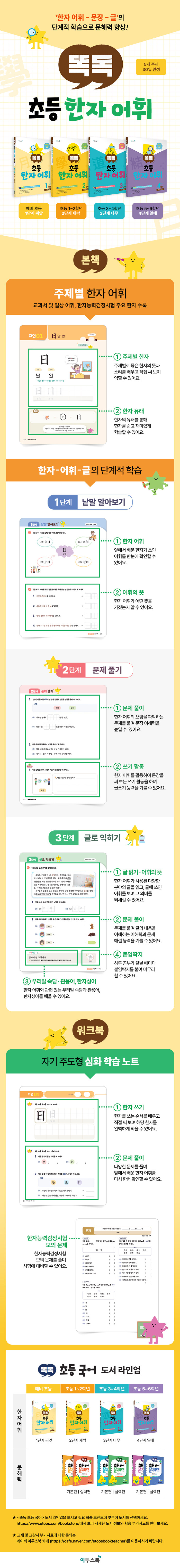 똑독 초등 한자 어휘는 '한자 어휘 - 문장 - 글'의 단계적 학습으로 문해력을 기를 수 있는 교재입니다.