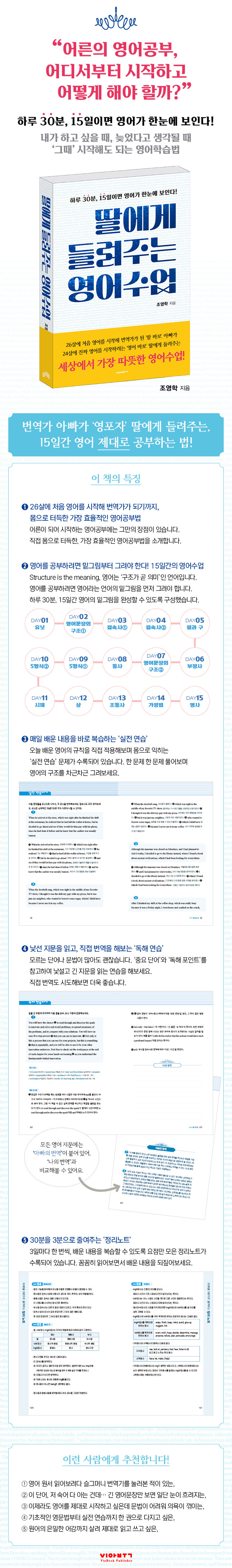 영어는 구조, 즉 생김새로 읽어야 하는 언어다. 일단 영어의 생김새를 그릴 수 있게 된 뒤에는 곧바로 읽기 훈련에 돌입하는 것이 최고의 공부법이다. 이를 위해 DAY 01부터 DAY 15까지, 총 15일간의 수업을 통해 영어의 밑그림을 완성할 수 있도록 고심하여 커리큘럼을 구성했다. 매 수업에서는 ‘왜’ 이런 규칙이 생겼는지, 실제로는 어떻게 활용되는지 풍부한 예문과 함께 살펴본다. 하루의 수업이 끝나면 ‘실전 연습하기’에서 배운 내용을 바로 복습해볼 수 있다. 저자가 직접 엄선한, 낯설고 다양한 지문이 수록된 ‘독해 연습하기’는 이 책의 중요한 특징 중 하나다. 모르는 단어나 문법이 있어도 괜찮다. 중요 단어와 독해 포인트를 참고하여 직접 번역까지 시도해보면 더욱 좋다. 이 책에 수록된 모든 영어 지문에는 저자가 직접 번역한 ‘아빠의 번역’이 붙어 있어, ‘나의 번역’과 비교해볼 수 있게끔 했다.
