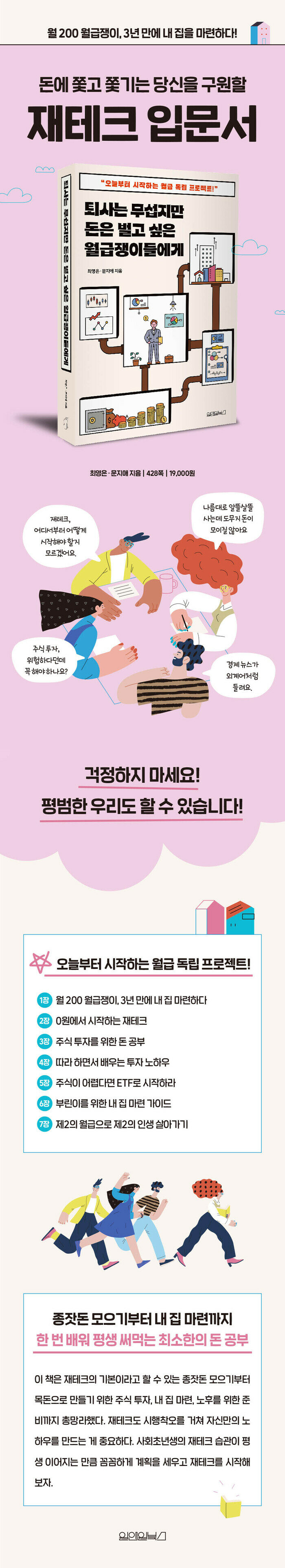 주식 투자를 망설이는 사람을 위해 5장 ‘주식이 어렵다면 ETF로 시작하라’에서 ETF에 대해 구체적으로 알아본다. 6장 ‘부린이를 위한 내 집 마련 가이드’에서는 청약통장의 기초, 꼭 알아야 하는 정부정책 등 사회초년생을 위한 부동산 공부에 초점을 맞췄다. 마지막 7장 ‘제2의 월급으로 제2의 인생 살아가기’에서는 지금까지의 공부에 더해 파이프라인을 늘리는 방법, 생애 자금 활용 테크트리 등을 담았다.