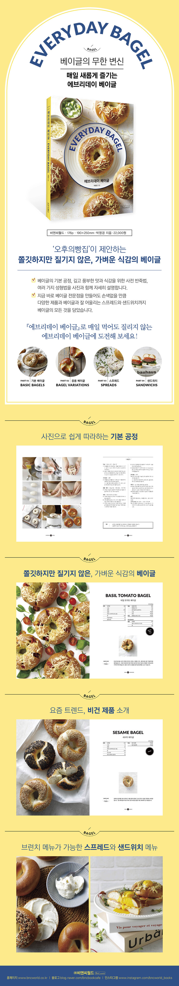 ‘오후의빵집’이 제안하는 에브리데이 베이글은 ‘오후의빵집’에서 개발하고 판매중인 베이글 메뉴로 구성되어 있다. 오후의 빵집이 제안하는 쫄깃하고 폭신한 식감의 베이글을 누구나 쉽게 만들 수 있도록 기본 공정을 사진과 함께 자세히 설명하고 있다. 이 책은 특히 믹서나 발효기가 없는 일반 가정에서도 손반죽 공정과 실온 발효만으로도 완벽한 베이글을 만들 수 있는 방법을 소개한다. 기본 성형법 이외에도 꼬는 성형, 필링을 넣는 성형, 마블 성형 등 다양한 성형법을 통해 개성 넘치는 베이글 모양을 완성할 수 있다. 특히, 부재료, 토핑을 얹는 형태의 심플한 베이글은 물론, 중종, 풀리시, 탕종 등 사전반죽을 사용한 레시피와 함께 필링을 채운 베이글도 담아 베이글 전문점을 만들어도 손색없을 만큼 다양한 제품을 담은 것이 특징이다. 요즘 트렌드인 비건 제품, 베이글과 잘 어울리는 스프레드와 샌드위치까지 소개해 맛과 식감, 비주얼까지 놓치지 않았다. 베이글은 냉동 보관하면 장기간 보관도 가능하다. 만든 다음날에도 제품의 변화가 크지 않고, 다시 데워 먹어도 맛이 좋아 온라인 판매를 하기에도 좋은 효자 상품이다. 이 책은 베이글을 새롭게 만들어 판매하고 싶은 매장이나, 베이글 메뉴에 신상품을 더하고 싶은 제과점, 브런치 카페에서 부가적인 수익을 올리는데 큰 도움이 될 것이다.