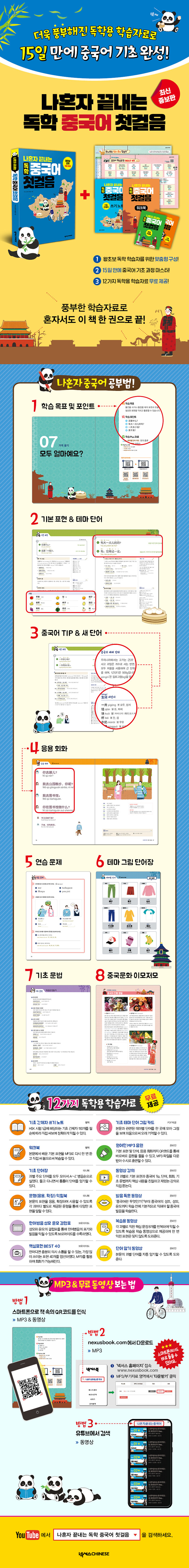 〈나혼자 끝내는 독학 중국어 첫걸음〉은 중국어 공부를 처음 시작하는 왕초보 분들을 위해 개발된 독학자 맞춤형 교재입니다. 학원에 다니지 않아도, 단어장이나 다른 참고서를 사지 않아도 이 책 한 권만으로 15일 만에 중국어 기초 과정을 마스터할 수 있도록 구성되어 있습니다.