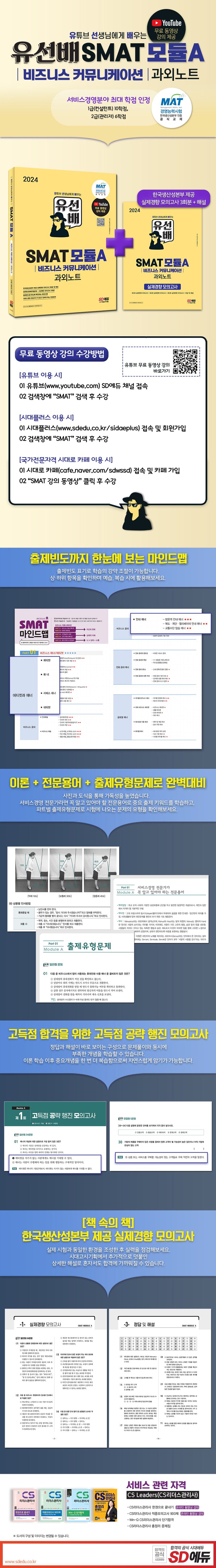 한국생산성본부에서 주관하는 국가공인 자격시험 SMAT(서비스경영자격)은 급증하는 인력수요를 보이는 서비스 산업의 핵심 성공요인을 선별하여 서비스 직무의 현업 지식 및 역량을 평가하는 실무형 자격시험입니다. Module A 비즈니스 커뮤니케이션은 서비스 전문 직무뿐만 아니라 거의 모든 사무직 종사자에 필요한 기본소양을 다루므로, 그 중요성이 크다고 할 수 있습니다. 이러한 SMAT의 철학을 담아, 현장에서 전문적이고 유용하게 쓰이는 서비스 실무형 이론에 대한 생생한 이해가 가능하도록 제작하였습니다. 또한 무료 동영상 강의를 제공하여 혼자 학습하는 수험생도 합격하는 데 무리가 없도록 구성하였습니다.