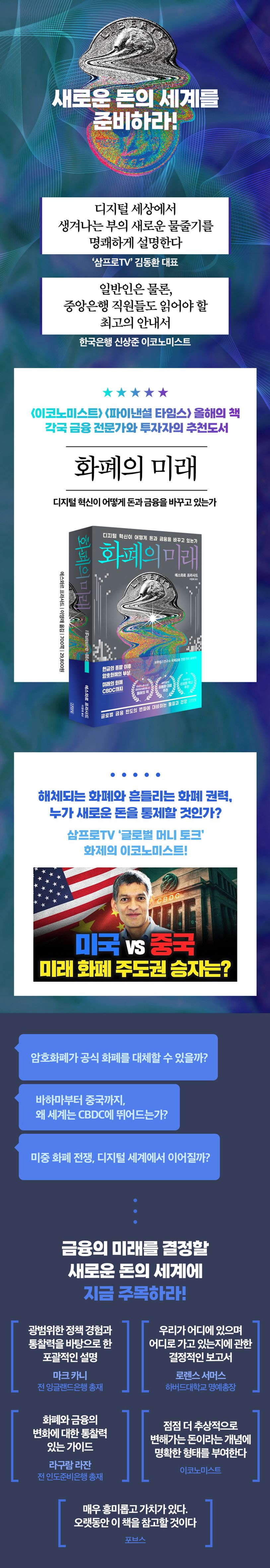 저자 에스와르 프라사드 교수는 국제통화기금(IMF)과 브루킹스연구소 등에서 세계 금융의 변화를 누구보다 빠르게 파악하고 전망해온 국제금융 전문가로, 암호화폐로 대표되는 핀테크 혁신 이후 각국 정부와 중앙은행이 이 흐름을 주도하기 위해 어떤 정책을 펼치며 대비하고 있는지 낱낱이 파헤친다. 《화폐의 미래》는 출간 직후 “추상적으로 변해가는 돈의 개념을 가장 명확하게 설명하는 책”이라는 평과 함께 각국 금융 전문가들의 격찬을 받았고, 〈이코노미스트〉 〈파이낸셜 타임스〉 〈포린 어페어〉 등 유수의 전문지에서 ‘올해의 책’으로 선정되는 등 화제를 모았다. 핀테크로 도약하는 신흥경제국부터 비트코인의 경제학, 달러와 디지털 위안화의 기축통화 경쟁까지, 금융의 미래를 결정할 새로운 돈의 세계에 주목하라.