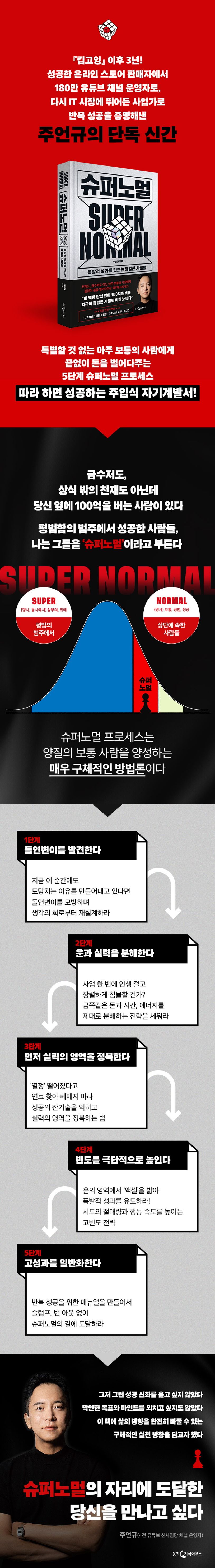다만 여기에는 인생을 완전히 바꿀 수 있는 구체적인 실천 방향, 즉 ‘슈퍼노멀 법칙’이라는 간단명료한 방법론만이 담겨 있다. 그는 이 방법을 친구와 지인에게 알려주었고, 현재 그들은 슈퍼노멀 법칙을 적용해 자신만의 사업을 일구며 ‘뛰어난 보통 사람’으로 성장했다. 폭발적인 성과를 반복해서 만드는 ‘양질의 보통 사람’이 되고 싶다면, 이 책을 펼쳐라. 원하는 그것이 이 책에 모두 들어 있다.