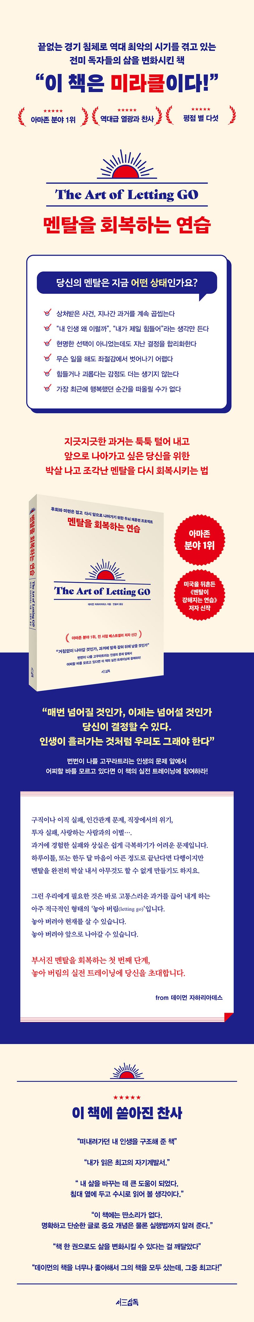 이 책은 코로나 엔데믹 이후 끝없는 경기 침체로 역대 최악의 시기를 겪고 있는 미국의 독자들의 삶을 극적으로 변화시키면서 “솔직히 책을 한 권 읽고 내 삶을 변화시키기란 쉽지 않다. 하지만 이 책으로는 가능했다”, “데이먼의 책을 너무나 좋아해서 그의 책을 모두 샀는데, 그중 최고다!” 등의 찬사를 받고 있다. 당신에게도 이제 삶을 변화시킬 수 있는 기회가 주어졌다. 《멘탈을 회복시키는 연습》은 과거의 후회와 미련, 부정적인 감정을 마주하고, 나 자신을 용서한 뒤 더 단단하고 강해진 멘탈을 가질 수 있도록 이끌어 줄 것이다. 이 책을 통해 당신이 마땅히 누려야 할 모든 행복을 만끽하며 거침없이 앞으로 나아가길 바란다.
