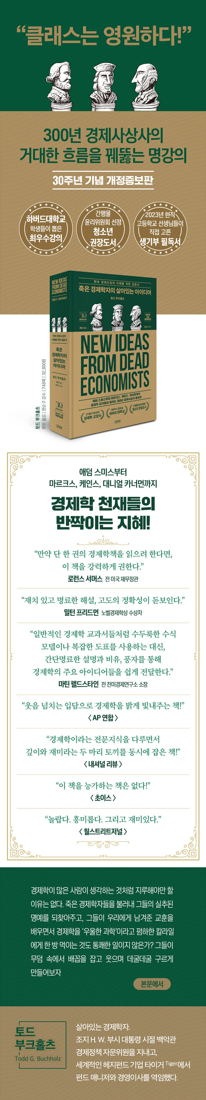 저자 토드 부크홀츠는 백악관 경제 자문위원과 월스트리트의 투자 자문위원, 펀드 매니저로 활동한 세계적인 경제학자다. 이 책은 그가 하버드대학교에서 선보인 전설의 명강의를 엮은 것으로, 1989년 영문 초판이 나온 이후 15개국에서 번역된 초장기 베스트셀러다. 1994년 출간된 한국어판은 간행물윤리위원회 청소년 권장도서, 서울대·카이스트·연세대 재학생 추천도서 등에 이름을 올렸다.