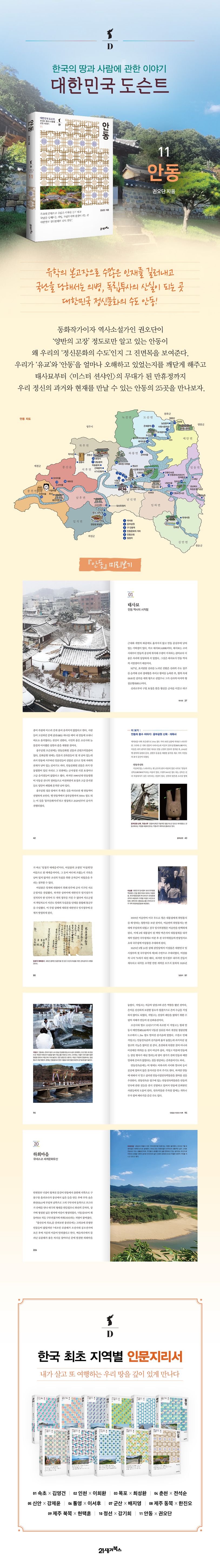 새로운 곳을 갈 때, 여행을 떠날 때, 우리가 필요로 하는 정보는 교통편, 숙소, 맛집뿐만 아니라 그곳이 어떤 곳인지를 이해할 수 있는 사전지식도 필요하다. 그래서 필요한 책이 ‘대한민국 도슨트’ 시리즈다. 그림이나 유물유적을 설명해주는 것처럼 우리나라 곳곳의 역사와 문화, 그곳에 사는 사람과 땅에 대해 알려주는 책들. 이번에는 『대한민국 도슨트 11_안동』이 출간되었다. 안동은 안동시(10동)와 1읍(풍산읍), 13면(길안면, 남선면, 남후면, 녹전면, 도산면, 북후면, 서후면, 예안면, 와룡면, 일직면, 임동면, 임하면, 풍천면)으로 이루어졌다.