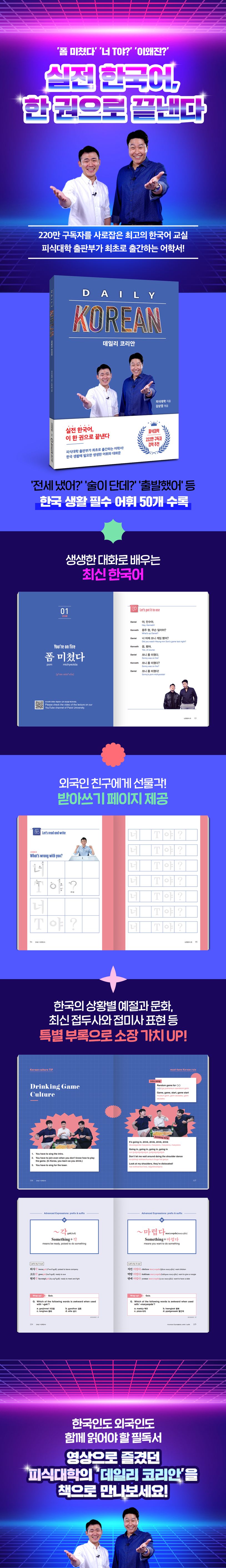 이처럼 랭귀지 리버스(Language Reverse)라는 단순한 테크닉으로 국내와 해외 구독자를 동시에 사로잡은 피식대학이 가진 코미디 공력의 진수를 《데일리 코리안》을 통해 경험해 보자. ‘폼 미쳤다’, ‘중꺾마’ 등 세대를 불문하고 폭넓게 사용하는 최신 유행어부터 ‘이 왜 진’, ‘너 T야?’ 등 MZ 세대의 핵심 신조어, 이미 우리에게 일상적인 관용구로 자리 잡은 ‘돌아보고 올게요’, ‘술이 단데’와 같은 표현을 영어 상황극을 통해 풀어낸다. 아직 영상 콘텐츠로 공개되지 않은 내용까지 먼저 만나볼 절호의 기회다. 상황극의 분위기를 몸소 재연하는 코미디언들의 ‘킹받는’ 사진과 어린 시절의 향수를 자극하는 받아쓰기 페이지도 재미를 더하며 각 장 사이에 수록된 ‘한국 문화 배우기’ 부록과 갓○○, 어쩔○○, ○○알못 등 한국어 트렌드에 맞춤한 접두사 및 접미사 소개 페이지, 카카오톡과 온라인 메신저 등 다양한 모바일 환경에서 활용할 수 있는 축약어 페이지까지 한 권의 책으로 알차게 담아냈다. 날로 높아지는 K-콘텐츠의 위상에 감화하여 한국어를 배우고 싶다는 외국인이 늘고 있다. 한국어에 가볍게 접근할 수 있는 교재를 찾는 외국인 친구가 있다면 그들에게 건넬 최고의 선물이 될 것이다.
