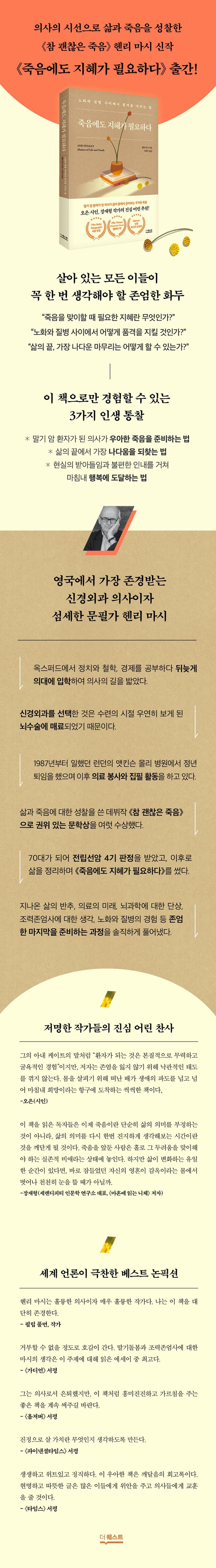 《참 괜찮은 죽음》이 삶과 죽음을 교차하며 떠올린 통찰이었다면 《죽음에도 지혜가 필요하다》는 우아하고 지적인 죽음을 위한 명상과도 같다. 헨리 마시는 오만함과 까칠함을 내려놓고 비로소 편안해졌다고 고백한다. 자신히 흠뻑 취해 있던 태양빛을 이제는 후배와 후손들이 누릴 차례라면서. 이 책에서 공유했듯, 부정과 인내를 거쳐 행복에 도달하는 의식의 흐름은 나이가 들어가는 모든 사람이 거치게 되는 과정이다. 나이가 든 독자들은 공감하면서, 나이가 덜 든 독자들은 예감하면서 읽어보면 그 깊은 의미를 느낄 수 있을 것이다.