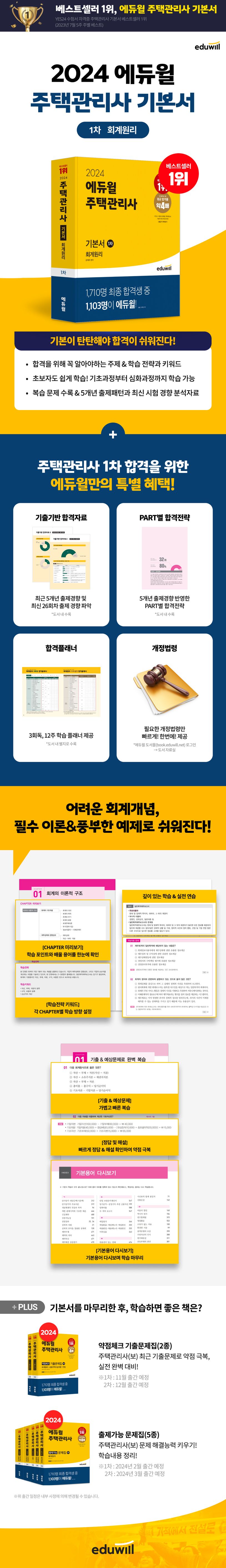〈2024 에듀윌 주택관리사 1차 기본서 회계원리〉는 최신 출제경향을 완벽하게 분석하고 최신 개정된 한국채택국제회계기준 등을 반영하여 주택관리사(보) 회계원리 시험에 최적화된 내용으로 구성하였습니다. 또한 이론과 관계되는 ‘개념적용 문제’와 체계적인 복습이 가능한 ‘기출&예상문제로 완벽 복습’ 등으로 실제 시험에 대한 문제풀이 능력을 향상시킬 수 있도록 하였습니다.