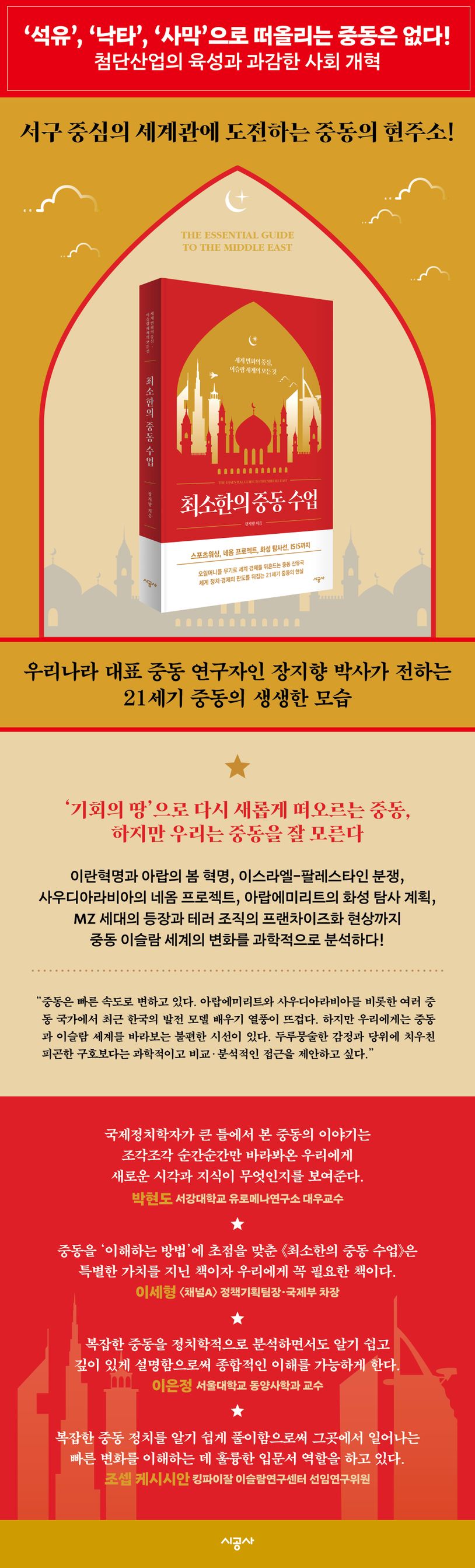 오랫동안 ‘중동’을 연구해온 장지향 박사는 《최소한의 중동 수업》을 통해 중동 이슬람 세계를 이해하는 가장 기본적이고 핵심적인 지식을 제공한다. 중동의 역사와 기존의 평가뿐 아니라 현재 중동 세계에서 일어나고 있는 개혁과 변화의 바람까지 상세하게 다루고 있다. 중동 이슬람 세계에 대한 과학적이고 비교·분석적인 저자의 글을 통해 우리는 단편적인 이해에서 벗어나 체계적이고 종합적인 ‘앎’을 체득할 수 있다.