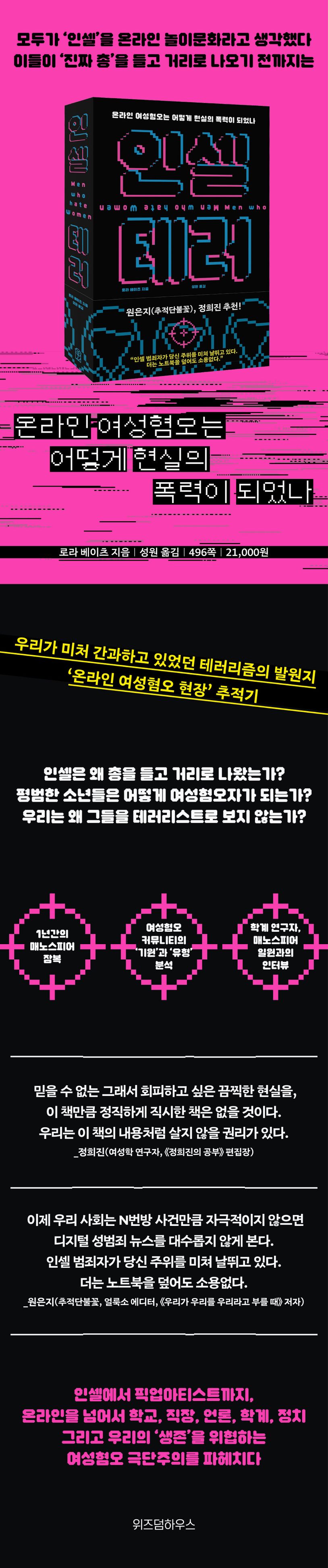 이 과정에서 우리는 왜 이들이 백인 남성 ‘역차별’과 신이 내린 ‘섹스권’을 주장하는지, ‘표현의 자유’를 운운하며 이들이 내세우는 ‘유머와 밈’이 얼마나 위험한지, 언론과 소셜미디어가 이들의 범죄를 어떻게 부추기는지, 이들이 정치권을, 정치권이 이들을 어떻게 이용하고 있는지, 왜 인셀들이 ‘총’을 들고 거리로 나왔는지 알게 될 것이다. 또한 우리의 코앞까지 들이닥친 위협의 실체가 분명히 보일 것이다.