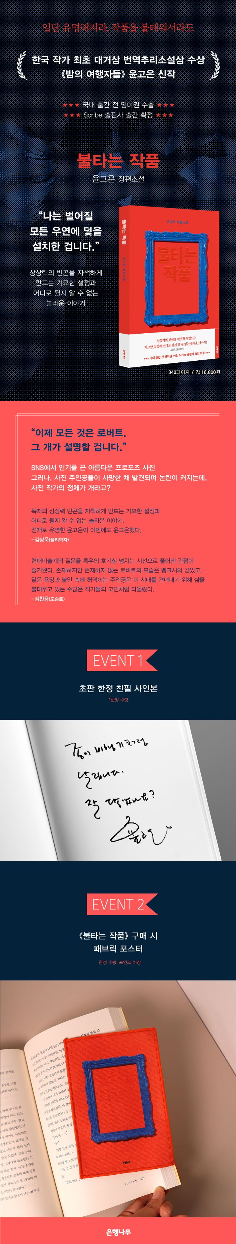소설집 《1인용 식탁》 《알로하》 《늙은 차와 히치하이커》 《부루마불에 평양이 있다면》 장편소설 《무중력증후군》 《밤의 여행자들》 《해적판을 타고》 《도서관 런웨이》 등으로 자기만의 작품세계를 구축해온 윤고은의 신작 장편소설 《불타는 작품》. 존재하지만 존재하지 않는 예술 작품들의 창작과정과 불태워져야지만 최고의 작품으로 둔갑되는 그 순간들을 윤고은 특유의 깊고 섬세한 통찰로 만나보게 되었다.