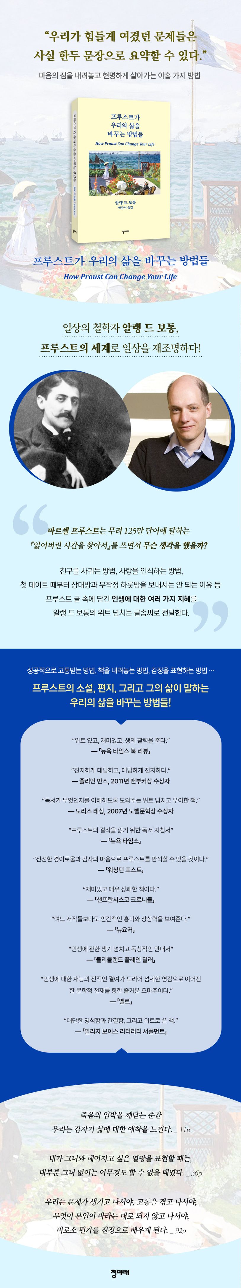그 탐구 대상인 프루스트의 산문에 버금가는 드 보통의 이 빛나는 산문은 우리에게 이른바 친구를 만드는 방법, ‘성공적으로’ 고통받는 방법, 책을 내려놓는 방법, 그리고 사랑을 인식하는 방법 등 삶을 바꿀 수 있는 아홉 가지 방법들에 대해서 조언한다. 그의 문장을 따라가며 우리의 삶과 프루스트의 삶을 비교하다 보면, 우리는 그토록 힘들게 여겼던 문제들이 사실은 한두 가지 문장으로 요약할 수 있는 것임을 깨닫고는 마음속의 무거운 짐을 가볍게 내려놓을 수 있게 된다.