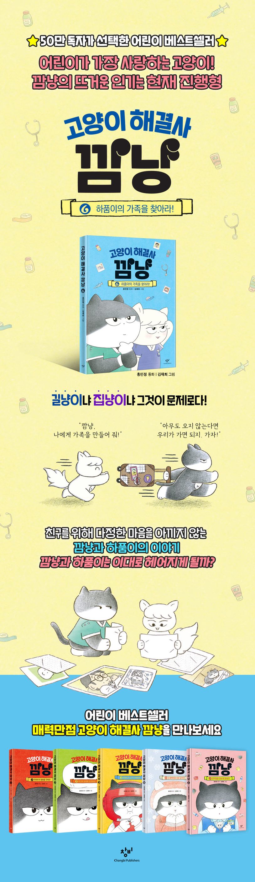 재미와 감동, 유익함까지 고루 갖춘 어린이책 베스트셀러 ‘고양이 해결사 깜냥‘ 시리즈 6권이 출간되었다. 명실상부 어린이가 가장 사랑하는 고양이 캐릭터로 자리매김한 깜냥은 지금까지 아파트, 피자 가게, 태권도장, 눈썰매장, 편의점 등 어린이에게 친숙한 공간에서 재기발랄한 매력을 뽐내며 만능 해결사 역할을 톡톡히 해냈다. 이번 『고양이 해결사 깜냥 6: 하품이의 가족을 찾아라!』는 깜냥이 5권의 ’온동네편의점‘에서 만난 장난꾸러기 고양이 ’하품이‘와 함께 새로운 여행길에 오르는 장면으로 시작한다. 깜냥은 누군가와 함께 다니는 게 어색하기는 하지만 그리 나쁘지만은 않다고 판단해 하품이를 데려가지만 곧 후회한다. 때로는 티격태격, 때로는 알콩달콩한 호흡을 뽐내는 두 고양이의 발길이 닿은 곳은 깜냥이 어릴 적 지냈던 동물 병원이다. 병원에서 지내는 동안 하품이는 반려동물을 소중히 돌보는 보호자들을 보며 사람과 함께 사는 생활을 궁금해하고, 깜냥은 보호자들에게 다가가 특유의 친화력을 발휘, 깜냥깜냥 활약하며 하품이가 새 가족을 만나도록 돕는다. 사람들과 가족이 되기를 꿈꾸던 하품이는 집고양이로 행복하게 살아갈 수 있을까? 혼자 지내는 생활에 익숙해 하품이를 귀찮아했던 깜냥은 이제 가벼운 발걸음으로 새로운 여행을 떠날 수 있을까? 두 고양이가 진정으로 원하는 것은 무엇일까? 용기 가득한 마음으로 자신만의 길을 만들어 가는 두 고양이의 이야기가 흥미진진하게 펼쳐진다.