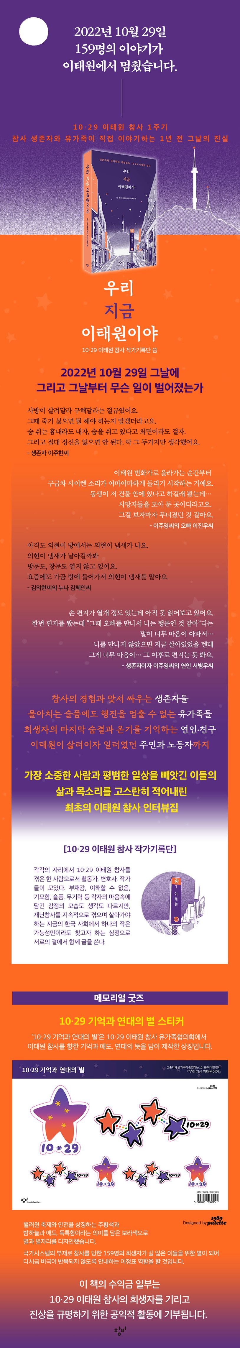2022년 10월 29일, 그날 이후 우리는 “책임의 외면, 권리의 침해, 정의의 공백 속에서”(5면) 나아갈 길을 잃은 채 부유하고 있다. 1년 365일의 시간이 흘렀고, 과연 무엇이 변했는지 자괴감이 들기도 한다. 하지만 세월에도, 비난에도, 무관심에도 결코 지워지지 않는 이야기가 이태원 그 길에 있다. “우리 지금 이태원이야”라는 제목에 담긴 이들의 목소리는 지금 여기에 남은 이들이 먼저 떠나간 이들에게 전하는 그리움이자 참사의 진실을 밝히겠다는 다짐이기도 하다. 이제는 우리가 응답할 차례다. 이 기록을 더 많은 이들과 공유하고 같이 기억하는 일, 참사의 진상을 밝히는 행동에 함께하는 일, 부서진 세계를 공감과 연대의 끈으로 다시 묶어내는 일이 이태원에서 지금 우리를 기다리고 있다.
