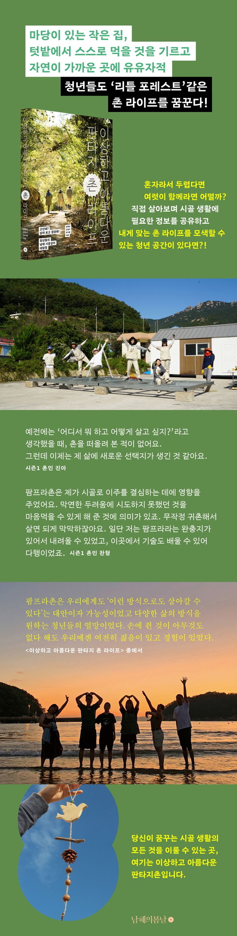 시골이 내게 잘 맞는지, 맞지 않는지는 사실 살아 봐야 알 수 있다. 저마다 꿈꾸는 시골 생활에 대한 로망이 다르겠지만, 핵심은 네트워크다. 팜프라는 청년들에게 촌 라이프에 필요한 정보 공유는 물론, 촌에 살아갈 때 필요한 유용한 기술을 가르쳐 주고, 또 마을 네트워크에 진입장벽 없이 다가갈 수 있도록 돕는 네트워크 허브 역할을 한다. 집짓기 워크숍, 촌집 알아보기, 텃밭 가꾸기, 바다에서 요가 수업 열기 등 이곳에서 청년들은 내가 꿈꾸는 촌 라이프의 모든 로망을 실험해 볼 수 있다. 짧은 여행이나 ‘한달살이’에 부족함을 느끼는 청년들, 도시 생활에 찌들어 다른 삶의 터전을 모색해 보고 싶은 모든 사람들에게, 이 책은 가슴 뛰는 초대장을 보낸다. 오세요, 이상하고 아름다운 판타지촌으로!