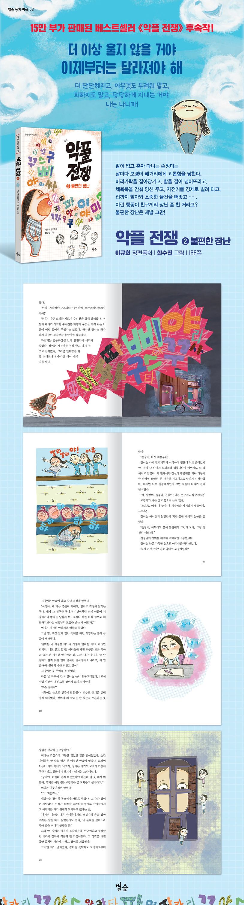 오랜 시간 동안 15만 부가 판매되며 국내와 세계 여러 나라의 수많은 어린이들에게 각별한 사랑을 받아 온 《악플 전쟁》의 후속권 《악플 전쟁 2: 불편한 장난》이 출간되었습니다. 《악플 전쟁》에서는 사이버 공간에서 벌어지는 언어 폭력의 문제점을 다루어 어린이들이 상대를 존중하고 배려하는 올바른 인터넷 문화를 알아가는 데 도움을 주었다면, 《악플 전쟁 2: 불편한 장난》은 갈수록 심해지고 있는 학교 폭력의 문제점을 다루어 학교 폭력을 막고자 마련된 법과 제도뿐 아니라 사람에 대한 예의와 존중하는 마음이 중요하다는 것을 이야기합니다. 《악플 전쟁》에서 느낄 수 있는 아주 특별한 재미와 감동이 《악플 전쟁 2: 불편한 장난》에도 고스란히 담겨 있어서, 《악플 전쟁》의 후속권이 나오길 기다리는 수많은 어린이들에게 즐거움 가득한 선물이 될 것입니다.