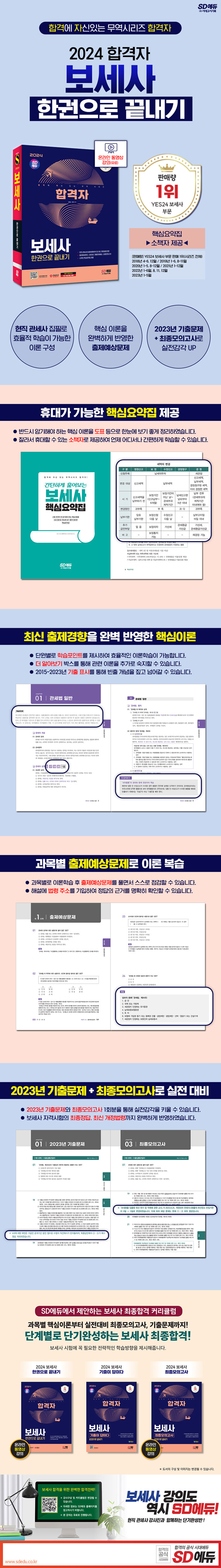 보세사 부문 판매량 1위 합격에 자신있는 무역시리즈 <2024 SD에듀 합격자 보세사 한권으로 끝내기> ▶ 최신 개정법령을 반영한 핵심이론만 모두 모아 5과목을 한권에! ▶ 학습한 이론을 바로 점검할 수 있는 과목별 출제예상문제! ▶ 2023년 최신 기출문제와 최종모의고사 제공! ▶ 현직 관세사가 집필하여 다가올 2024년 시험에 완벽 대비! ▶ 소책자 핵심요약집으로 언제 어디서나 학습 가능!