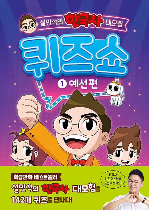 <설민석의 한국사 대모험 퀴즈쇼> 1권 예선 편은 한국사 퀴즈 마스터를 뽑는 한국사 퀴즈쇼를 콘셉트로 하여, 책을 읽는 어린이 독자들이 퀴즈쇼에 직접 참가하는 듯한 몰입감과 긴장감을 느낄 수 있습니다. 또 교과서와 한능검 기출 문제를 바탕으로 뽑은 142개의 한국사 퀴즈를 풀며 재미있게 한국사를 익힐 수 있습니다. 친구, 가족과 따로 또 같이 한국사 퀴즈를 풀며 색다른 한국사를 경험해 보세요!