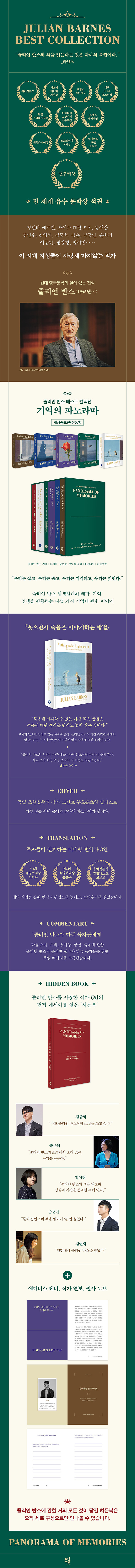 2011년 맨부커상 수상작 『예감은 틀리지 않는다』를 시작으로 지금까지 꾸준히 줄리언 반스의 작품을 소개해 온 다산책방에서 줄리언 반스의 명작 다섯 권을 선별해 개정증보 특별판으로 재구성했다. 출간 후 오랜 기간 꾸준히 사랑받아 온 『예감은 틀리지 않는다』 외 소설 2종과 에세이 2종을 ‘기억’이라는 테마로 엮고, 그 기억을 ‘파노라마’로 표현한 표지에 담아, ‘기억의 파노라마’라는 이름으로 선보인다.