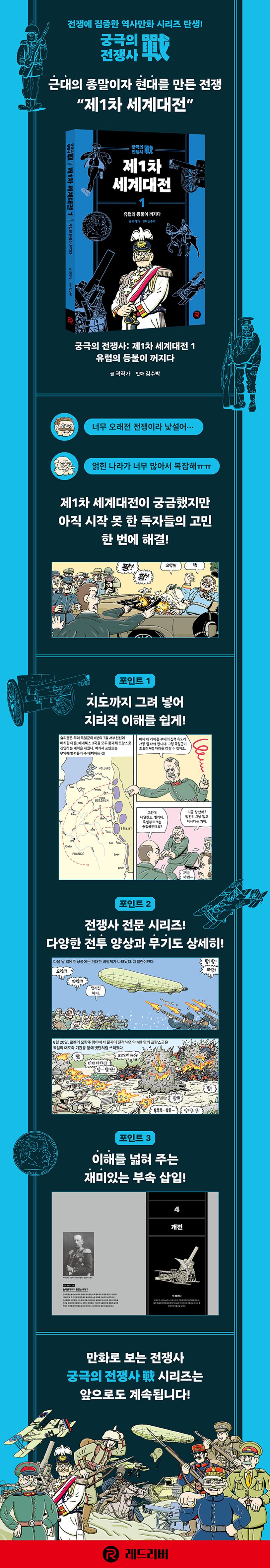 동양과 서양, 고대부터 현대까지를 통틀어 모든 전쟁을 만화로 보는 궁극의 전쟁사 시리즈가 탄생했다. 시리즈의 포문을 여는 《제1차 세계대전》은 ‘현대’를 만든 전쟁이라 평가받지만 제2차 세계대전에 밀려 주목받지 못한 ‘대전쟁’을 다뤘다. 사라예보 사건, 참호전, 베르사유 조약 등 단편적인 사건만 기억되는 제1차 세계대전에 대해 정치, 경제, 사회, 문화 등까지 다루는 것은 물론, 많은 지도를 삽입해 전장의 현실을 실감 나게 전달한다.