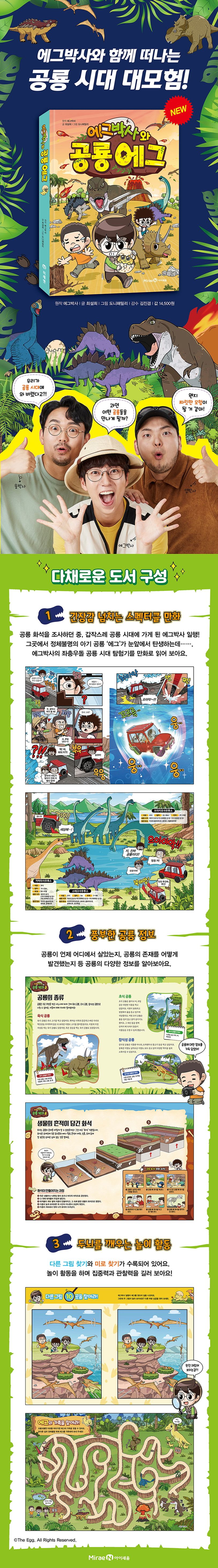 《에그박사와 공룡 에그》는 인기 키즈 크리에이터 ‘에그박사’의 새로운 공룡 학습 만화입니다. 공룡 화석을 조사하던 중, 갑작스레 공룡 시대에 떨어진 에그박사 일행은 정체불명의 아기 공룡 ‘에그’의 탄생을 목격하게 되지요. 과연 이들은 에그의 가족을 찾아 주고 집으로 무사히 돌아갈 수 있을까요? 에그박사 일행의 좌충우돌 공룡 시대 탐험기를 재미있는 만화로 읽고, 공룡에 대한 다양한 정보도 얻어 보세요!