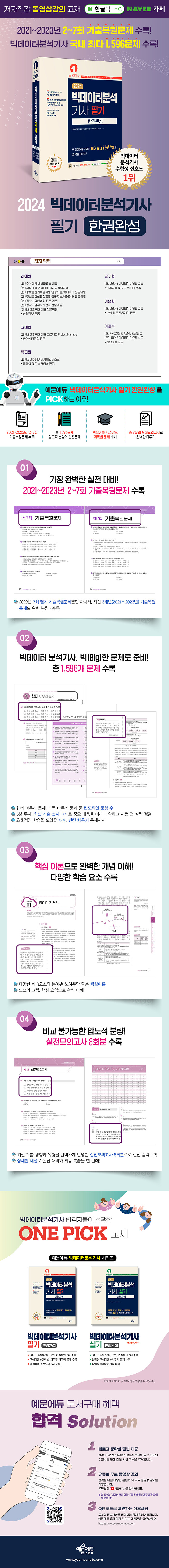 2021년에 시행된 2, 3회부터 가장 최근에 시행된 2023년 6, 7회 빅데이터분석기사 필기시험을 완벽히 복원하여 수록하였다. 전 과목 80문항의 기출복원문제에 상세한 해설을 더해 수험생으로 하여금 실제 시험의 출제 경향을 직접 파악하고 다가올 시험에 확실히 대비할 수 있도록 하였다.