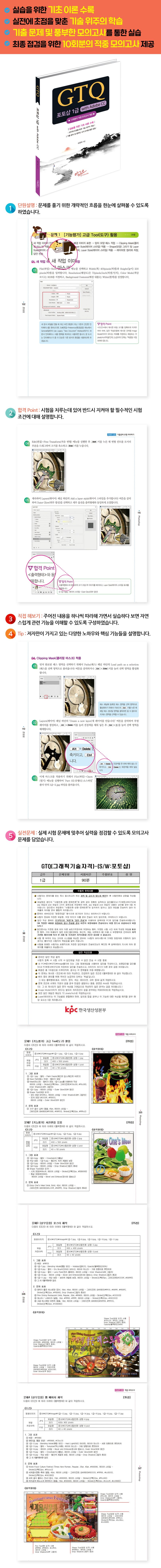 Adobe CC 버전을 이용하여 GTQ 자격증을 따기 위한 수험생을 위해 실무에서 다년간 컴퓨터그래픽 교육을 담당하고 있는 전문 강사가 자세한 기본기능 설명과 실무 예제 등을 통하여 체계적으로 학습할 수 있도록 기획하였습니다.