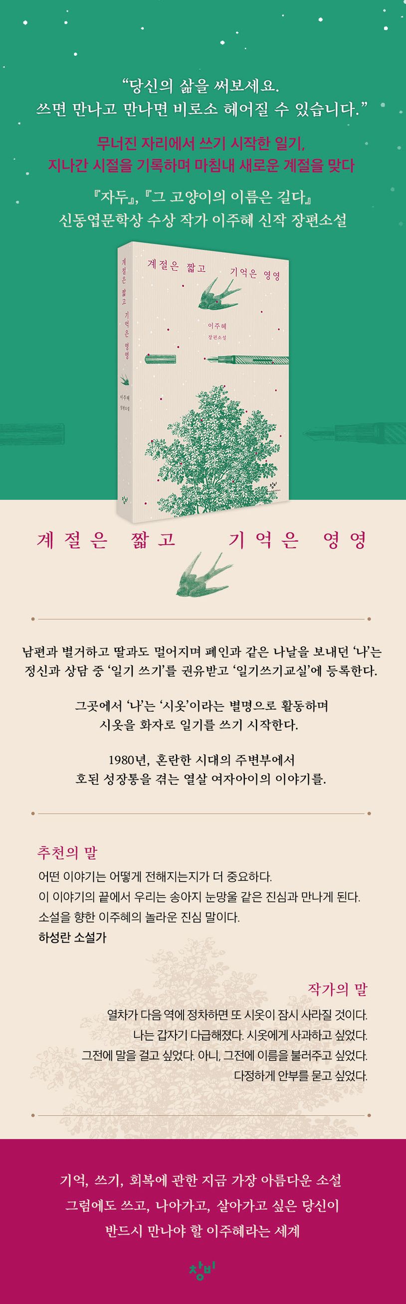 이주혜는 “힘겨움 안에도 자존과 지혜의 시간이 있다는 것을 잊지 않는”(신동엽문학상 심사평) 작가인바,『계절은 짧고 기억은 영영』은 절망과 통증의 어제 속에서 “매순간 끊임없이 선택하면서 그렇게 한발 한발 앞으로 걸어”(324면)가려고 노력했던 순간들을 건져 올려 힘겨운 오늘을 구원하는 이야기이다. 소설 속에서 ‘나’는 여태 해소되지 않은 어린 시절의 아픔을 쓰며 괴로워하지만, 일기 쓰기는 다시 고통에 투신하는 일만은 아니다. “이제 나는 살았나? 살아남았나?”(76면)라는 질문처럼, 오히려 과거의 시련에도 불구하고 지금 여기 생생히 살아 있는 자신을 새로이 감각하며 서서히 내면의 힘을 다지는 일인 것이다. 일기 속에서 어린 자신이 눈앞의 현실을 헤쳐가기 위해 저지른 숱한 선택들을 복기하며 ‘나’는 지금 발 딛고 선 자리에서 어느 쪽으로 걸음을 옮겨야 할지 고민한다. 그곳은 까마득한 절벽일까, 아니면 “다른 이야기로 넘어갈”(224면) 문턱일까. 신중하고 진실한 목소리로 전해지는 이 회복의 서사를 마지막까지 지켜보자. 어느새 읽는 이의 삶까지 뜨겁게 데우는 “이주혜의 놀라운 진심”(하성란, 추천사)을 목격하게 될 것이다.