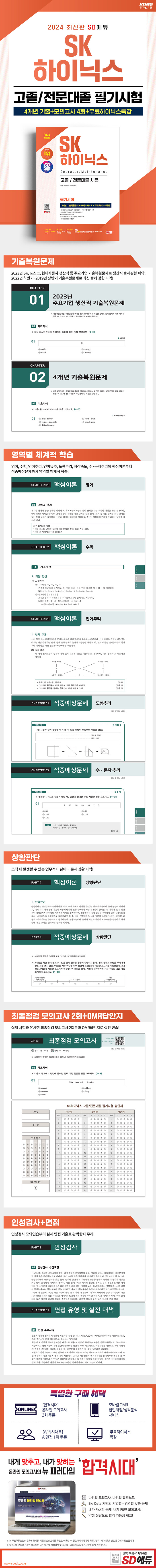 부록 CHAPTER 01 2023 주요기업 생산직 기출복원문제 CHAPTER 02 4개년 기출복원문제 PART 1 기초지식 CHAPTER 01 영어 CHAPTER 02 수학 PART 2 언어이해 CHAPTER 01 언어추리 CHAPTER 02 언어유추 PART 3 패턴이해 CHAPTER 01 도형추리 CHAPTER 02 지각속도 CHAPTER 03 수·문자추리 PART 4 상황판단 PART 5 최종점검 모의고사 제1회 최종점검 모의고사 제2회 최종점검 모의고사 PART 6 인성검사 PART 7 면접 CHAPTER 01 면접 유형 및 실전 대책 CHAPTER 02 SK하이닉스 실제 면접 별책 정답 및 해설 PART 1 기초지식 정답 및 해설 PART 2 언어이해 정답 및 해설 PART 3 패턴이해 정답 및 해설 PART 5 최종점검 모의고사 정답 및 해설 접기