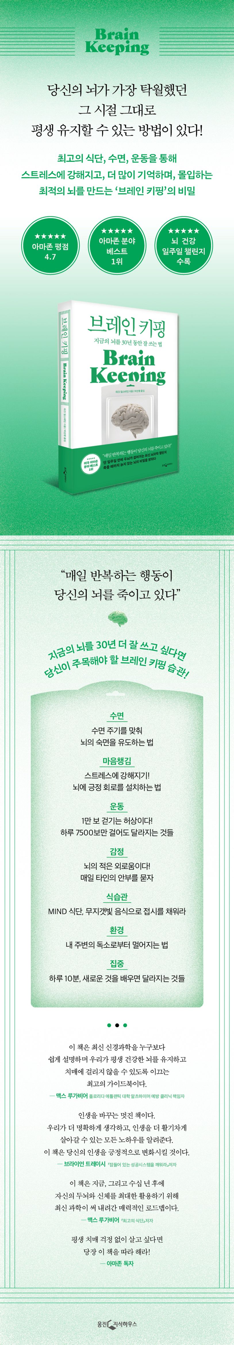 마크 밀스테인 박사는 최근 젊은 사람들에게까지 번져간 이 ‘뇌 건강 문제’를 해결할 수 있는 최신 뇌 과학 연구와 구체적인 방법을 소개하고자 『브레인 키핑』을 썼다. 미국의 뇌 건강 연구가이자, ‘최적의 뇌를 유지하는 법’을 소개하는 강연가인 저자는 이 책을 통해 우리의 뇌를 망치는 건 매일 반복하고 있는 ‘습관’이며, 이를 근본적으로 개선할 수 있는 ‘7가지 생활 습관’을 소개하고 이를 실천할 수 있는 구체적인 방법을 전한다.