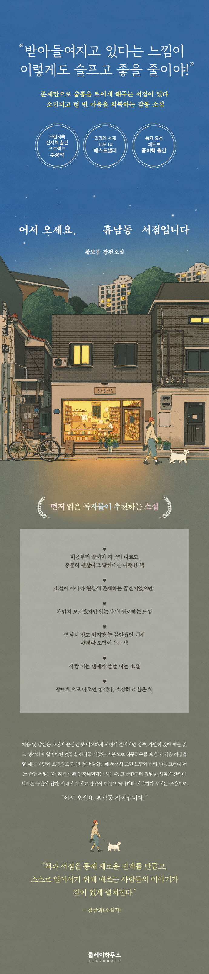 출간 즉시 전자책 베스트셀러 TOP 10에 오르고 150개의 독자 리뷰가 올라온 소설이 있다. “종이책으로 나오면 좋겠다! 소장하고 싶은 책”, “읽는 내내 위로받는 느낌”, “소설이 아니라 현실에 존재하는 공간이었으면”, “지친 일상의 피로회복제 같은 소설” 등 수많은 찬사를 받으며, 브런치북 전자책 출판 프로젝트 수상작들 중 단연 가장 큰 인기를 누리고 있다. 황보름 장편소설 『어서 오세요, 휴남동 서점입니다』는 전자책 구독 서비스 플랫폼인 밀리의 서재에 공개된 후 종이책으로도 읽고 소장하고 싶다는 독자들의 끊이지 않는 요청으로 마침내 종이책으로 출간되었다.