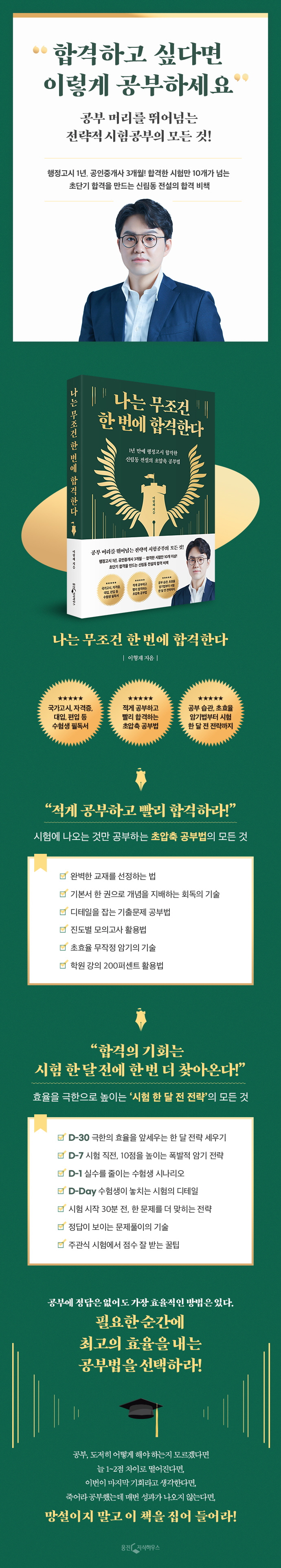 취업, 승진, 그리고 내 집 마련까지 어려워진 지금, 시험은 인생 역전을 꿈꿀 수 있는 가장 공정하고 강력한 수단이다. 이를 증명하기라도 하듯 매년 공무원 시험을 준비하는 사람은 물론, 제2의 인생을 꿈꾸며 공인중개사를 비롯한 다양한 자격증을 따기에 나섰다. 『나는 무조건 한 번에 합격한다』는 1년 만에 행정고시에 합격한 신림동 전설이라 불리는 이형재가 지난 15년간 수십 번 합격하며 터득한 모든 시험에 통하는 합격 전략을 A부터 Z까지 담아낸 최고의 합격 비책이다.