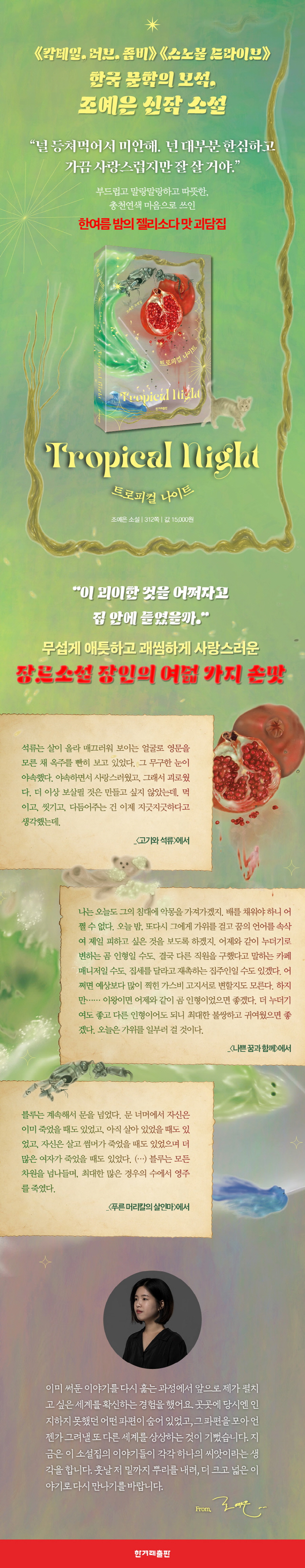 《트로피컬 나이트》는 누군가에게 힘이 되는 이야기다. 수록작 〈고기와 석류〉를 예로 들면, 이렇다. 남편이 죽고 아들도 떠나 혼자 남은 노인이 있다. 노인은 어린아이의 얼굴을 한 괴물을 우연히 만나고, 괴물을 집 안에 들이고야 만다. 노인은 괴물에게 잡아먹히게 될까? 아니다. 조예은의 이야기는 전혀 다르게 흘러간다. 그의 소설은 힘든 삶을 힘들다고 말하는 데서 끝나지 않는다. 공포를 보여주지만 공포가 우리의 삶을 갉아먹도록 내버려두지 않는다. 어쨌든 삶은 계속되니까. 소설이 끝난 뒤에도 이야기는 이어지니까. 이야기가 계속되는 한 조예은의 인물들은 끝까지 살아내고 버틴다. 삶이 계속되는 한 조예은의 이야기는 반드시 밝은 방향으로 나아간다. 신작 소설 《트로피컬 나이트》 또한 그렇다.