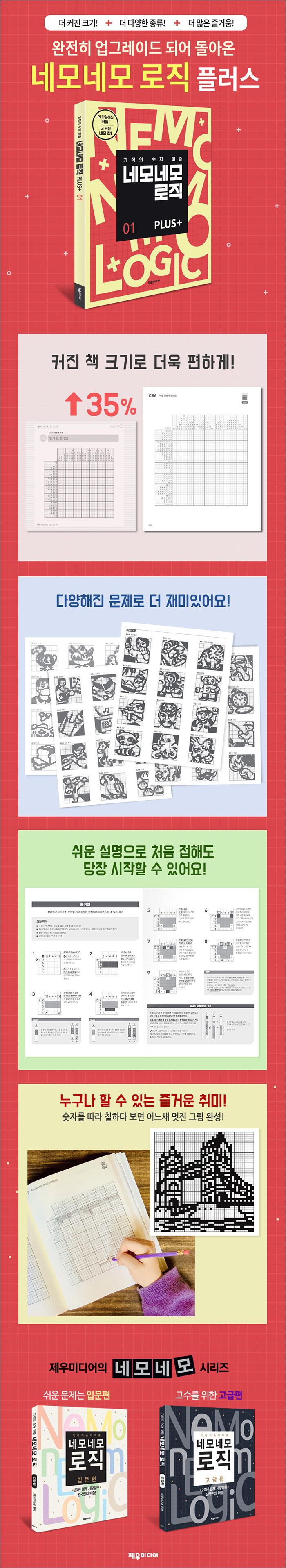 더 커진 사이즈로 업그레이드! 모두가 좋아하는 기적의 퍼즐. 네모네모 로직이 더욱 업그레이드된 ‘네모네모 로직 플러스’로 돌아왔다. 커진 책 사이즈로 문제를 보고 칠하는 게 편해졌고, 난이도도 다양해져 즐길 거리가 많아졌다.