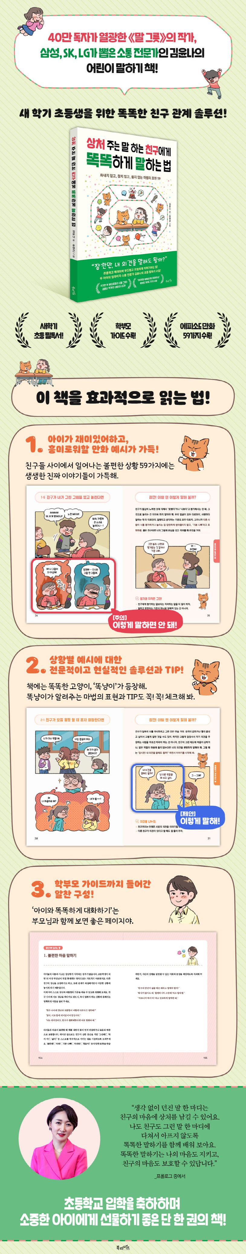 아이가 친구와 싸웠거나 상처받는 말을 들었을 때 상황 파악과 문제 해결에만 집착하기보다는 먼저 아이의 말을 잘 들어 주고 공감하는 데 집중해야 한다. 아이가 말하지 않은 것을 함부로 넘겨짚어서도 안 된다. 아이에게 어떻게 해결하고 싶은지 묻고, 나름의 대안을 생각해 보도록 기다려 주어야 한다. 그런 다음 이 책을 아이와 함께 읽으며 실질적인 대화법을 가르쳐 준다면, 똑똑한 말하기 방법을 더 확실하게 체득해 자기 의사를 정확하게 표현하면서도 상대방을 배려할 줄 아는 단단한 사람으로 성장할 것이다.