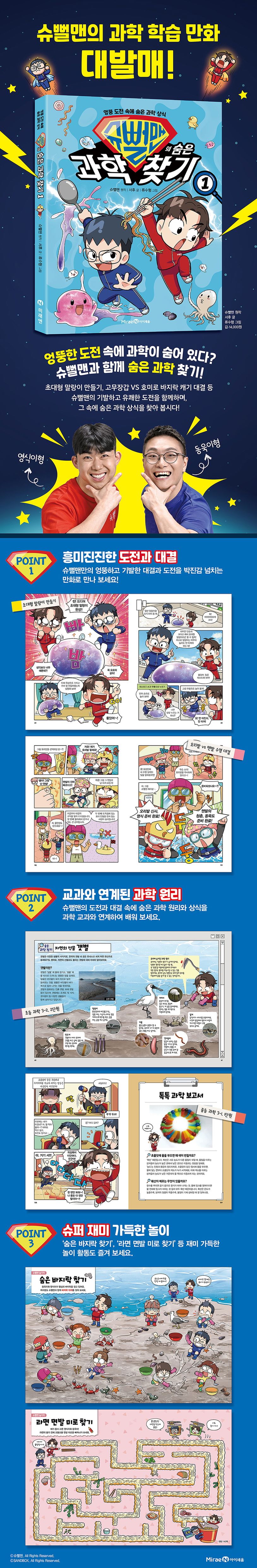 《슈뻘맨의 숨은 과학 찾기》는 유튜브 크리에이터 슈뻘맨의 기발하고 유쾌한 도전을 함께하며, 그 속에 숨은 과학 원리와 상식을 찾아 보는 과학 학습 만화 시리즈입니다. 초대형 말랑이를 만들며 배우는 ‘액체, 고체, 기체의 개념’과 고무장갑VS호미로 바지락 캐기 대결을 펼치며 배우는 ‘갯벌의 생태’와 ‘호미의 원리’ 등 슈뻘맨의 도전과 대결을 즐기다 보면 어느새 과학 교과와 연계된 지식이 쑥쑥 자라 있을 거예요. 그럼 지금부터 슈뻘맨과 함께 숨은 과학을 찾으러 떠나 볼까요?