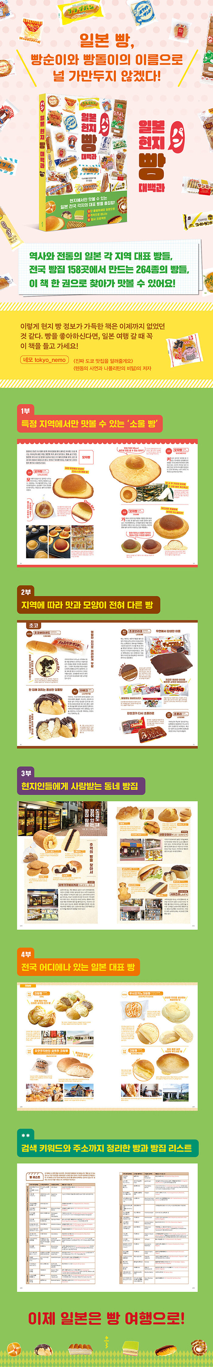 현지에 가야 맛볼 수 있는 라멘이 있듯, 빵 역시 현지 빵이 수없이 많다. 나도 홋카이도에 갔을 때 양갱빵을 처음으로 먹어보고 그 맛에 감탄했다(도쿄 출신인 내가 상상하지 못한 아이디어!). 여러분도 일본 지방에서 멋진 현지 빵을 만나주셨으면 한다. 이렇게 현지 빵 정보가 가득한 책은 이제까지 없었던 것 같다. 빵을 좋아하신다면, 일본 여행 갈 때 꼭 이 책을 들고 가세요!