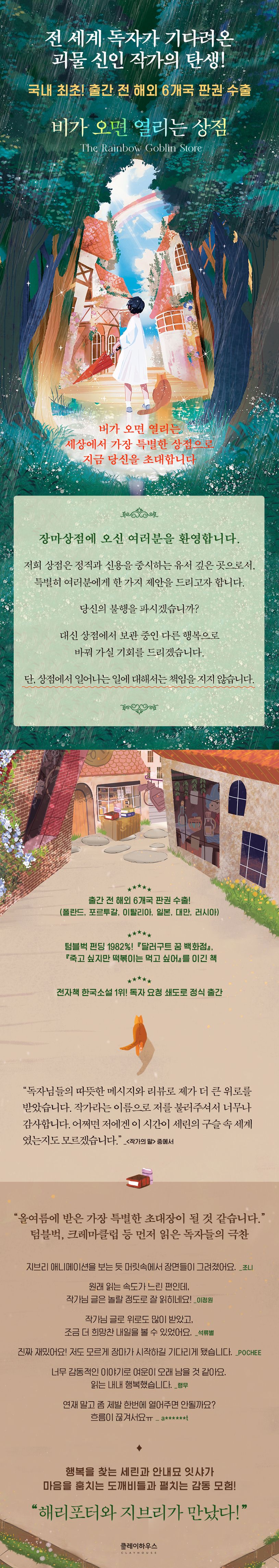 이 소설은 2023년 런던도서전에도 사전 소개되었고, “해리포터 시리즈나 지브리 애니메이션을 떠올리게 한다”라는 평가를 받으며 출간 전부터 큰 화제가 되었다. 폴란드, 포르투갈, 이탈리아, 일본, 대만, 러시아 등 6개국에 판권을 수출하면서, 언어를 뛰어넘는 ‘우리 이야기’의 힘을 널리 알렸다. 지금 삶에 지쳐 위로를 받고 싶다면, 혹은 새로운 도전을 앞두고 용기를 얻고 싶다면, 전 세계가 기다리는 힐링 판타지 소설 『비가 오면 열리는 상점』을 읽어보자.