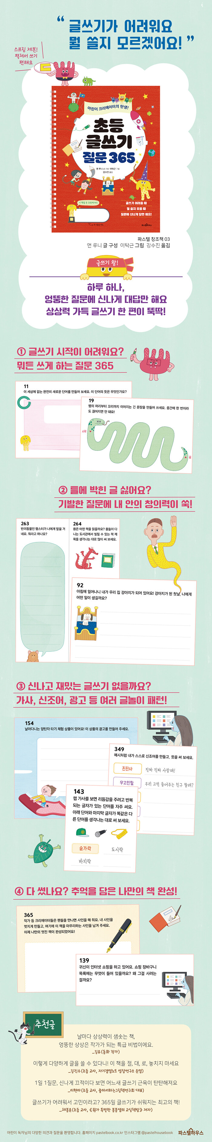 1일 1기발한 글쓰기 질문을 던지며 학교에서 배우는 기본 글쓰기인 일기, 독후감상문, 생활글, 설명글, 주장글 등을 연습하는 것은 물론이고, 광고 만들기, 네이밍 하기, 신조어 만들기, 랩 가사 쓰기 등 다양한 상황과 공간에서 실용적으로 활용할 수 있는 글쓰기까지 모두 연습할 수 있다. 다양한 글쓰기 패턴으로 문장과 단어를 가지고 신나게 놀 수 있어서 글쓰기가 익숙하지 않은 친구들도 흥미를 돋을 수 있다.