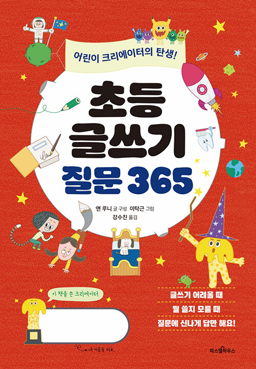 이 질문에 킥킥대며 나도 엉뚱하게 쓰다 보면 작가처럼 내 안에서 생생하게 펄떡대는 창의력, 상상력, 사고력을 모두 만나게 될 거예요. 애써 잘 쓰려고 하지 않아도 되고, 그저 내 마음껏 쓰면 되는 책이랍니다. 상투적이고 틀에 박히지 않은 글, 어디서 읽거나 본 적 없는 오직 나만의 글이 술술 나올 테니까요. 365가지 질문에 답하다 보면 지금 가장 관심 있는 일, 가장 바라고 있는 일, 가장 고민하는 일 등 나에 대해서도 더욱 잘 알게 된답니다. 지도하시는 어른이 어린이의 속마음을 만나고 싶을 때도 도움을 줄 거예요.