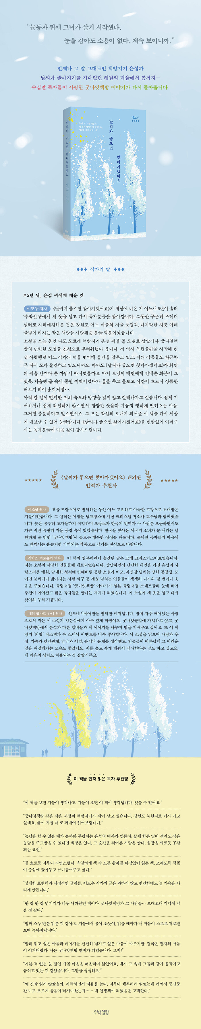 많은 독자들이 ‘읽고 또 읽어도 질리지 않는 인생 책’으로 손꼽았던 〈날씨가 좋으면 찾아가겠어요〉는 jtbc 드라마로 제작 방영되었고, 여러 나라 언어로 번역되어 해외 출간되기도 했다. 겨울에서 봄으로 가는 길목, 책방 난롯가에서 향긋하게 퍼지는 귤 냄새 같은 이야기와 다시 만나는 시간.